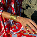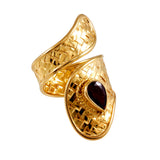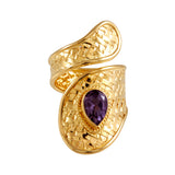 The Dewi Gold Curve Ring has been crafted with incredible attention to detail in Bali, Indonesia. Each piece is made of pure Sterling Silver and 24k Gold-plating and features a beautiful teardrop shaped semi-precious stone. Whether worn alone as a statement piece or together with other jewellery, such as our matching Dewi Gold Cuff, this ring is sure to elevate any outfit with its understated elegance. Choose from three mesmerising options: the rich purple hues of Amethyst, the vibrant blue Topaz or the fiery brilliance of garnet.