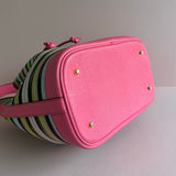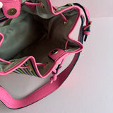 The Flores Bucket Bag is made of beautiful woven ikats sourced from different regions of Indonesia. Each piece is totally unique and only available once. This piece is made with contrast fuchsia pink leather and gold hardware. The strap is adjustable.