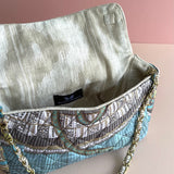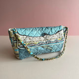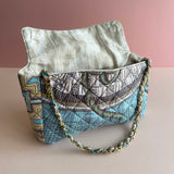 This particular piece is made using an Hermès Silk Carré ‘Cent Plis Des Miao' designed by Aline Honore and comes with a removable gold toned metal chain strap, that is twisted with a silk strap out of the same scarf.