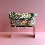 This particular piece is made using a vintage Hermès Silk Carré ‘Chapeau!' in beautiful shades of green and pink tones. It comes with a removable gold toned metal chain strap, that is twisted with a silk strap made out of the same scarf.