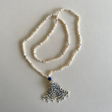 It is made of small baroque pearls together with sterling silver and blue Lapis lazuli or green Onyx beads. All of our pieces are handmade by a small family-owned jeweller in the heart of Jaipur, India.