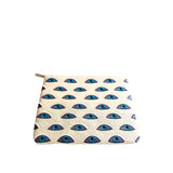 The Evil-Eye Pouch by Sophia203 is one our favourite bags here at The Jungle Emporium. Blue and purple 'evil eyes' with light pink eyelids are peeking from a nude coloured background. The perfect day to day or evening accessory and certainly an eye-catcher.
