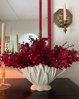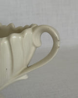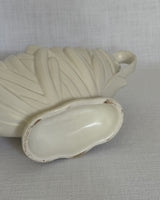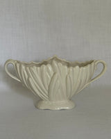 A vintage Mid Century Hyacinth mantle vase from England. This collectible piece features a distinctive leaf pattern and a double-handed , low wide shape. The perfect vessel for Hyacinth, orchids, low stemmed cut flowers but also very decorative just on its own on a stack of books. The beautiful vase is in very good vintage condition. It appears it has a small production flaw which is covered by the original glaze and hence not really noticeable. Ceramic with a white semi matt finish.