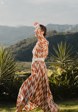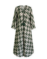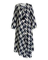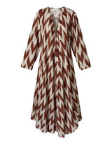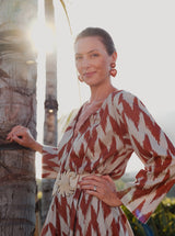 The Carlotta Ikat Kaftan is the perfect blend of style and comfort. The classic Ikat screen print is standing out in classic combinations of light grey paired together with Navy Blue, Scarlett Red, Sage Green or Fawn Brown.