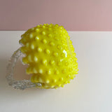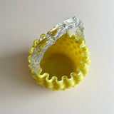 A stunning antique Victorian glass bowl with a nubby body and frilled edges in lemon yellow. It's a very decorative item just on its own or with short stemmed flowers in contrast colours.