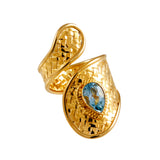 The Dewi Gold Curve Ring has been crafted with incredible attention to detail in Bali, Indonesia. Each piece is made of pure Sterling Silver and 24k Gold-plating and features a beautiful teardrop shaped semi-precious stone. Whether worn alone as a statement piece or together with other jewellery, such as our matching Dewi Gold Cuff, this ring is sure to elevate any outfit with its understated elegance. Choose from three mesmerising options: the rich purple hues of Amethyst, the vibrant blue Topaz or the fiery brilliance of garnet.