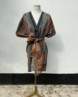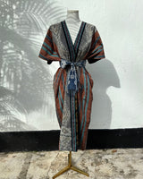 The Kaftans are lovingly sewn by a group of Indonesian women on the island of Java. They are using handwoven Ikats that are sourced from local villages all over Indonesia. Each Ikat is made of naturally dyed cotton thread handwoven on the backstrap loom by the indigenous community, using ancient weaving techniques. The colours and local pattern variations have been used for generations - each region and village has its own patterns.