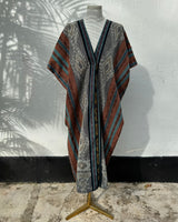 All of our Kaftans are only available in up to three pieces or less per style. Traditionally they come without pockets. Available in two lengths - long and short. Kaftan No 7 is a very classic Ikat pattern with shades of navy blue and grey with touches of terracotta stripes and a purple border.