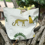 The Leopard Tote Bag is hand printed in Jaipur on Canvas with a custom-made silk tassel from Singapore. It is the perfect all day every day tote bag for little shopping and beach trips and ideal also as a travel companion as it is super lightweight. Please note that each bag is individual and never the same.
