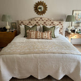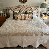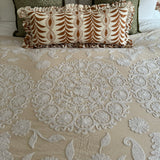 These exquisite Suzanis are entirely embroidered by hand in Uzbekistan. This one stands out in its simplicity - subtle shades of cream and delicate white embroidery patterns that are always totally unique. No piece is like the other and just available once.